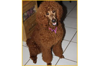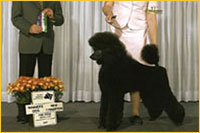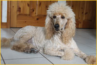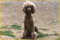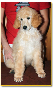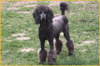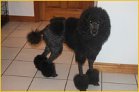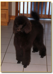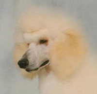The Poodle is the worlds most recognizable breed of dog. His body is very solid, with a slightly arched neck, and his chest well let-down. He has a firm muscular loin and his back is short--neither arched nor hollow, croup rounded but not sloping. His head is dignified, straight, and in total proportion to his body (pronounced occipital peak!) His nose must match his coat colour, and he has fairly tight lips. Again, the colour depending on his coat. He has a straight nose bride. The Poodle has almond-shaped eyes, which are slightly slanted. The eyes are black or very dark brown to dark amber in colour, depending again on his coat colour. His ears are fairly long, and hanging against the cheeks, with the tips reaching to the commissure of the lips when outstretched. They are covered with wavy, very long hair. He has remarkable muscular, well-boned legs-small, short, and oval feet. His tail is set high and docked. We only remove about ¼ of the tail, while other breeders tend to remove half.