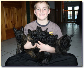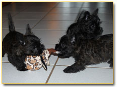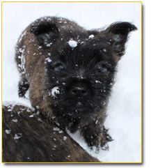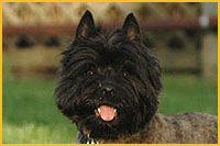 Grooming the Cairn Terrier: It is important, not only for the appearance, but also for the health and safety of your cairn, to groom it regularly. Cairns require frequent brushing, however, you should make an effort to never bathe them unless absolutely necessary (i.e. your dog rolls in something that cannot be brushed out), as this will have a negative impact on the Cairn's natural coat. Regular teeth brushing and nail clipping are equally important yet seldom implemented by Cairn owners due to the arduous task of keeping the dog still and firmly in place. Just as with children, the dog will make a fuss and resist you every step of the way, but hey, somebody has to do it! In the end, your Cairn will love you for it. Be sure to swab your Cairn's ears frequently in order to keep the wax and dirt build-up to a minimal. The Cairn's keen sense of hearing contributes greatly to its alert mental state, making it an exceptional guard dog. Remember, cleanliness is next to DOGLINESS!